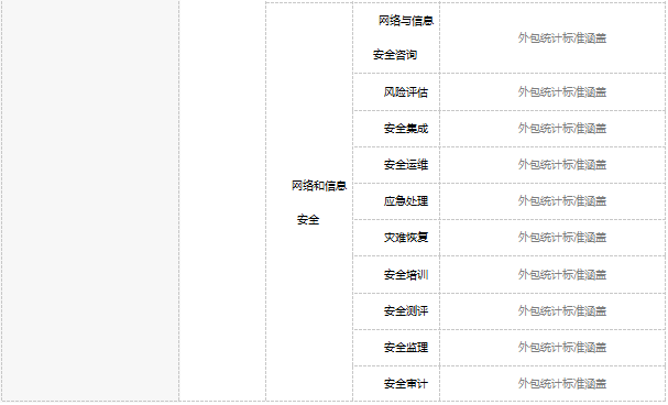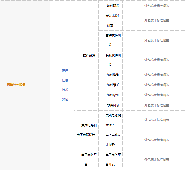 根据《服务外包统计调查制度》和《服务外包产业重点发展领域指导目录》,其中“离岸信息技术外包”主要包括八个细分门类: