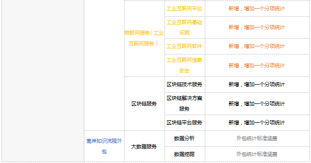 9、区块链技术服务:在《服务外包产业重点发展领域指导目录》并没有这个子项,但在《服务外包统计调查制度》中有“区块链技术服务”。