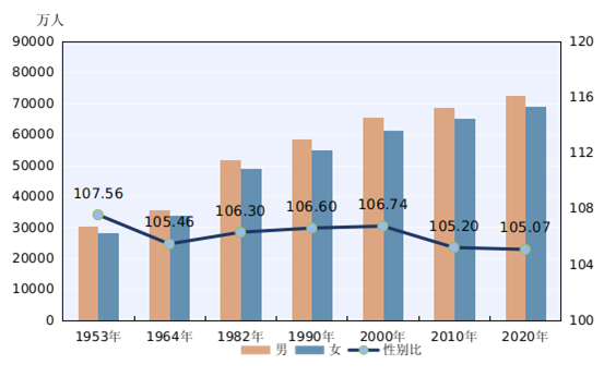 数据:我国男性人口为72334万人,占51.24%;女性人口为68844万人,占48.76%。总人口性别比(以女性为100,男性对女性的比例)为105.07,与2010年基本持平,略有降低。