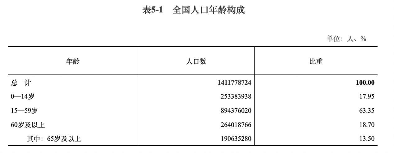 数据:我国0—14岁人口为25338万人,占17.95%;15—59岁人口为89438万人,占63.35%;60岁及以上人口为26402万人,占18.70%(其中,65岁及以上人口为19064万人,占13.50%)。