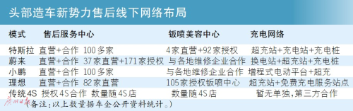 记者留意到,与传统“4S”不同,将售后独立于销售并“外包”给第三方的做法,很受新造车企业的欢迎。近日,零跑汽车牵手途虎养车扩充售后服务网络;蔚来、小鹏已分别官宣与在全国有200家连锁维修厂的华胜合作,为车主提供统一的维修服务或建立钣喷合作关系。特斯拉也已经在全国建起了近百家第三方合作的钣喷授权门店。风风火火发展起来的造车新势力,正风风火火地加速铺设售后渠道。车企维修网店的多少及分布关系到新品牌的影响力和服务能力。