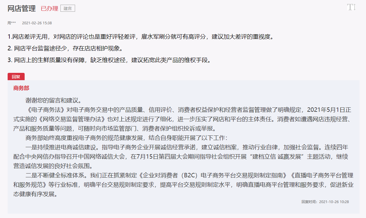 对此,商务部回复表示,《电子商务法》对电子商务交易中的产品质量、信用评价、消费者权益保护和经营者监督管理做了明确规定,2021年5月1日正式实施的《网络交易监督管理办法》也对上述规定进行了细化,进一步压实了网店和平台的主体责任。消费者如遭遇网店违规经营、产品和服务质量等问题,可随时向市场监管部门、消费者保护组织投诉或举报。
