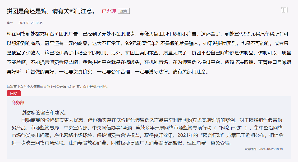 针对电商拼团乱象,商务部回复表示,对于网络销售假冒伪劣产品,市场监管总局、中央宣传部、中央网信办等14部门连续多年开展网络市场监管专项行动(“网剑行动”),集中整治网络市场各类突出问题,净化网络市场环境,保护消费者合法权益,取得良好效果。