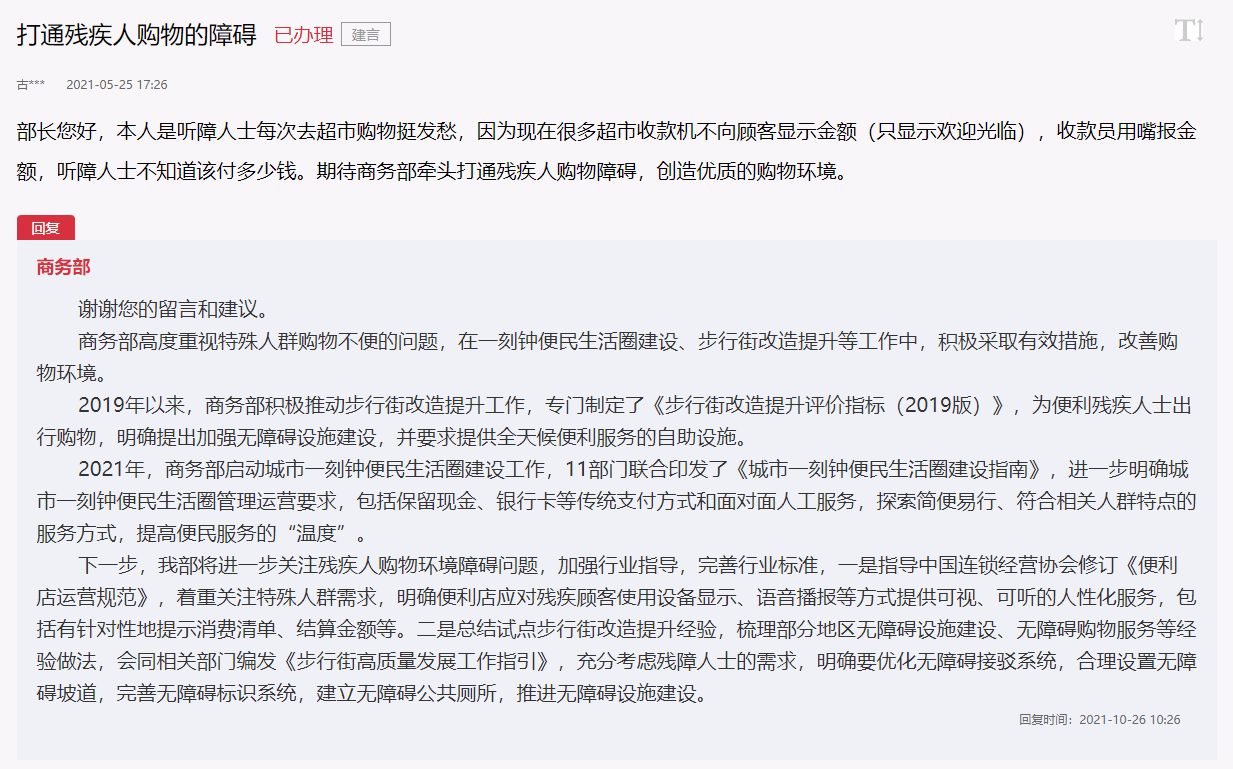 商务部回复表示,商务部高度重视特殊人群购物不便的问题,在一刻钟便民生活圈建设、步行街改造提升等工作中,积极采取有效措施,改善购物环境。