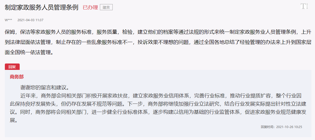 “同时,商务部将会同相关部门,进一步健全行业标准体系,逐步构建以信用为基础的行业监管体系,促进家政服务业规范健康发展。”商务部回复表示。