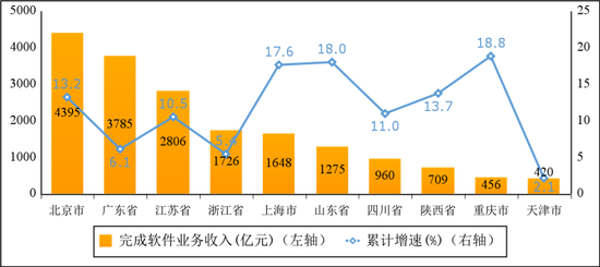 主要软件大省业务收入占比小幅下降。一季度,软件业务收入居前5名的省份中,北京市、广东省、江苏省、浙江省、上海市软件收入分别为4395亿元、3785亿元、2806亿元、1726亿元和1648亿元,分别增长13.2%、6.1%、10.5%、5.4%和17.6%,五省(市)合计软件业务收入14360亿元,占全国比重为71.6%,占比较去年同期回落0.8个百分点。
